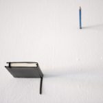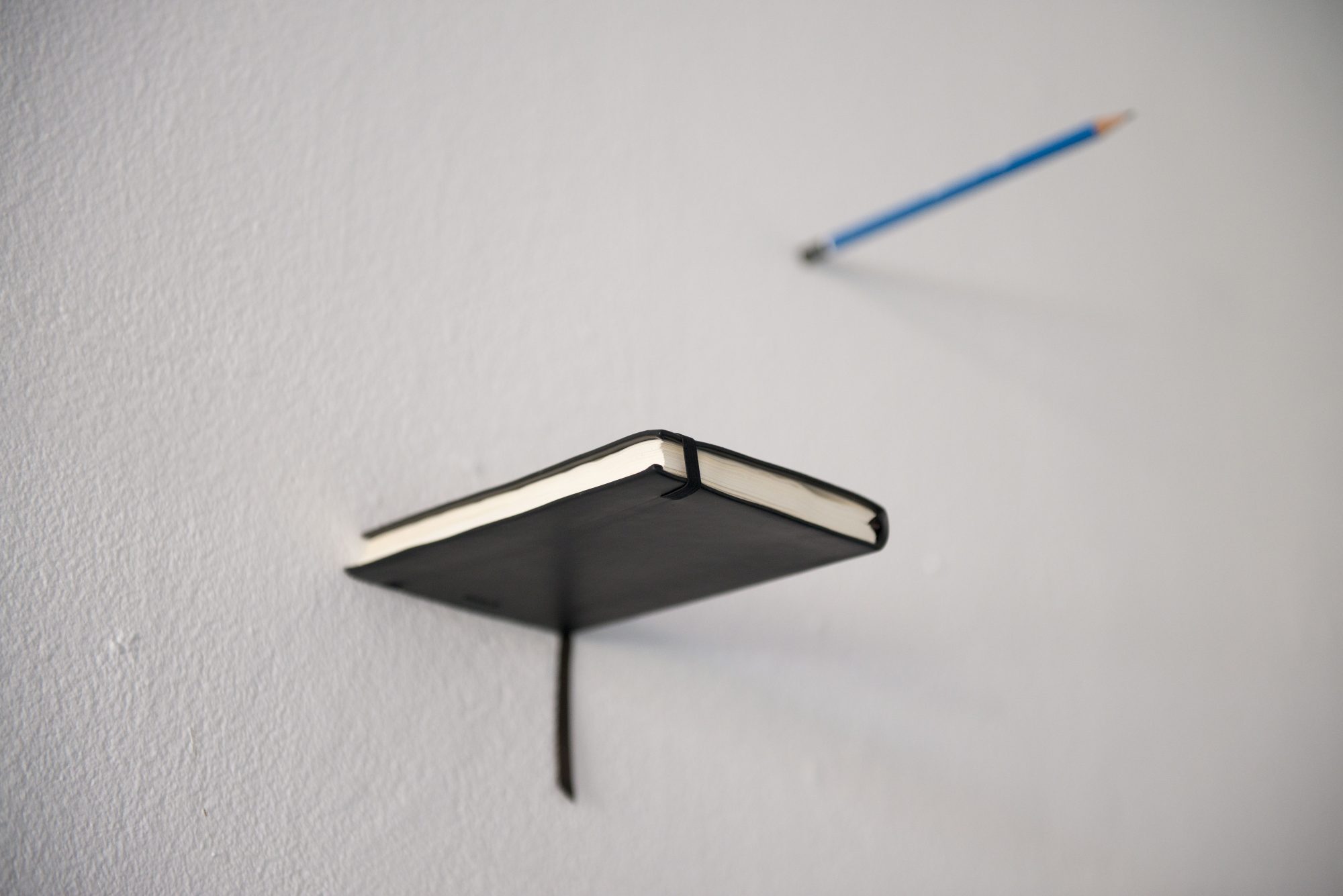 It was inspired by the futuristic office of Malachi Constant in ‘The Sirens of Titan’ by Kurt Vonnegut (1959). He commissions an office in which everything including tables and chairs float. A major theme in the novel is free will and the loss of gravity seems to add to this. Gravity is a subject that I frequently return to in my work and I wanted the notebook and pencil to appear as though they are floating from the wall as a nod to that and to the novel.